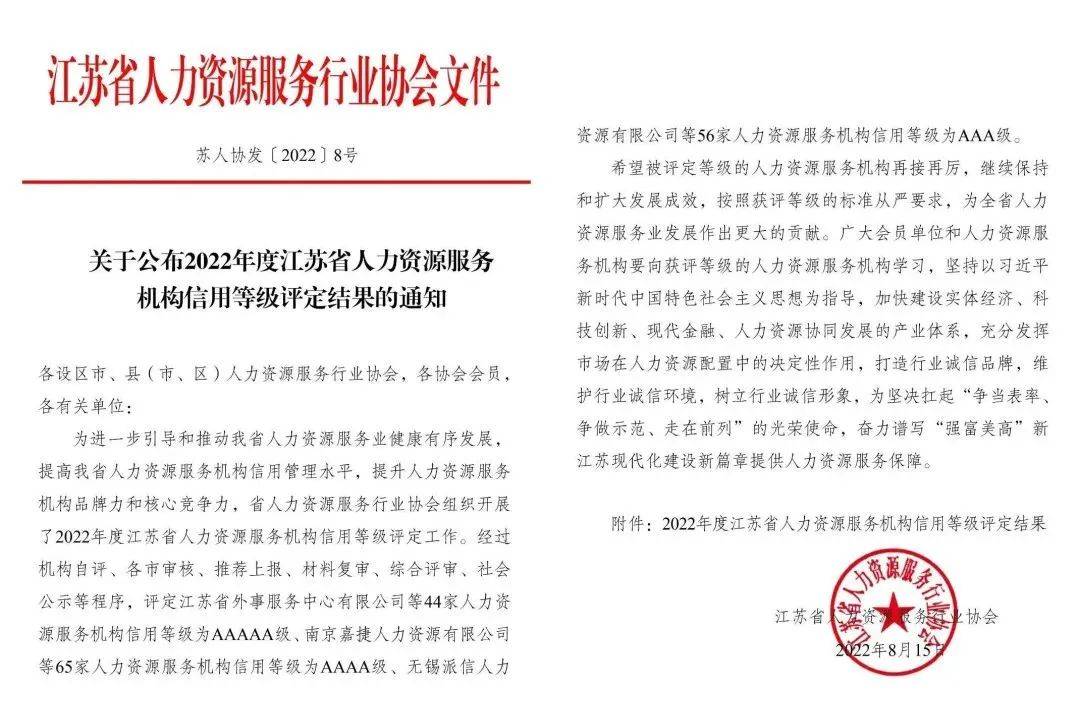 3月11日,江蘇省人力資源服務(wù)行業(yè)協(xié)會發(fā)布了“2022年度江蘇省人力資源服務(wù)機(jī)構(gòu)信用等級評定結(jié)果”。江蘇匯智人力資源有限公司獲評江蘇省人力資源服務(wù)機(jī)構(gòu)信用等級AAA級,并接受省人力資源服務(wù)行業(yè)協(xié)會授牌表彰。